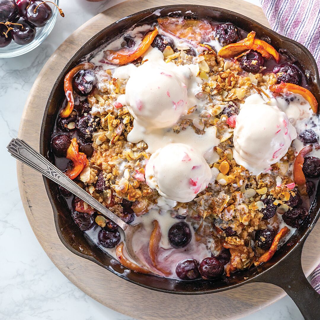 - In a large bowl, whisk together granulated sugar, nutmeg, remaining ⅓ cup flour, and remaining ¾ teaspoon cinnamon; stir in peaches, cherries, and vanilla until well combined. Pour fruit mixture into prepared skillet. Sprinkle oat mixture in large clumps all over fruit.