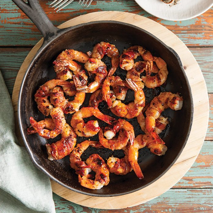 Pepper Jelly Glazed Bacon-Wrapped Shrimp
