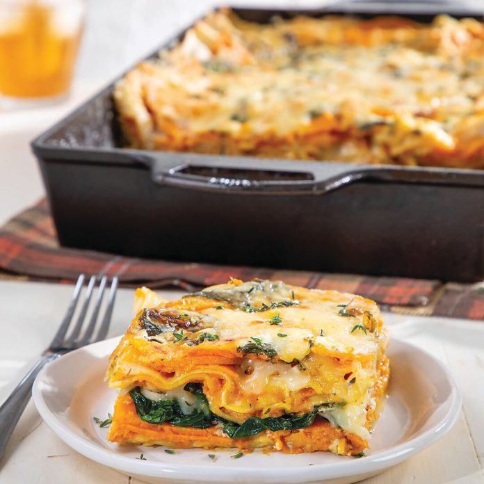 - Top spinach with 4 noodles. Spread remaining pumpkin mixture onto noodles; sprinkle with half of cheese. Top with remaining 4 noodles, remaining sweet potatoes, and remaining 1 cup spinach. Spread remaining onion sauce onto spinach. Spray a large piece of foil with cooking spray; cover lasagna, spray side down.