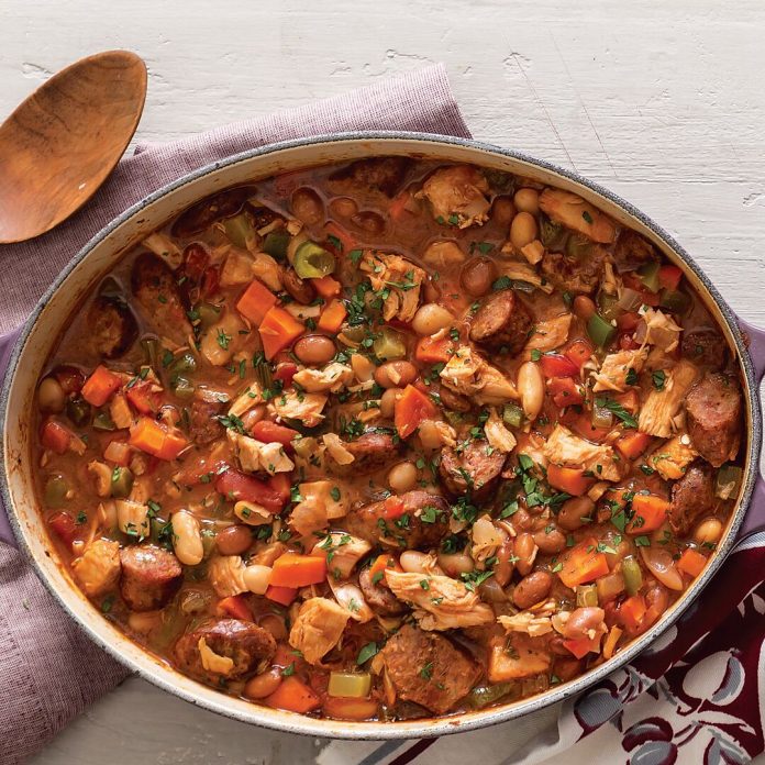 - Stir seasoning blend into drippings in pot; cook, stirring frequently, until tender, 3 to 4 minutes. Stir in tomato paste; cook for 1 minute. Stir in tomatoes, Homemade Turkey Stock, and wine; bring to a boil, scraping browned bits from bottom of pot with a wooden spoon. Stir in beans, turkey, vinegar, salt, pepper, and thyme. Reduce heat to medium; cook, stirring occasionally, for 20 minutes. Stir in sausage; cook until heated through. Garnish with parsley, if desired.