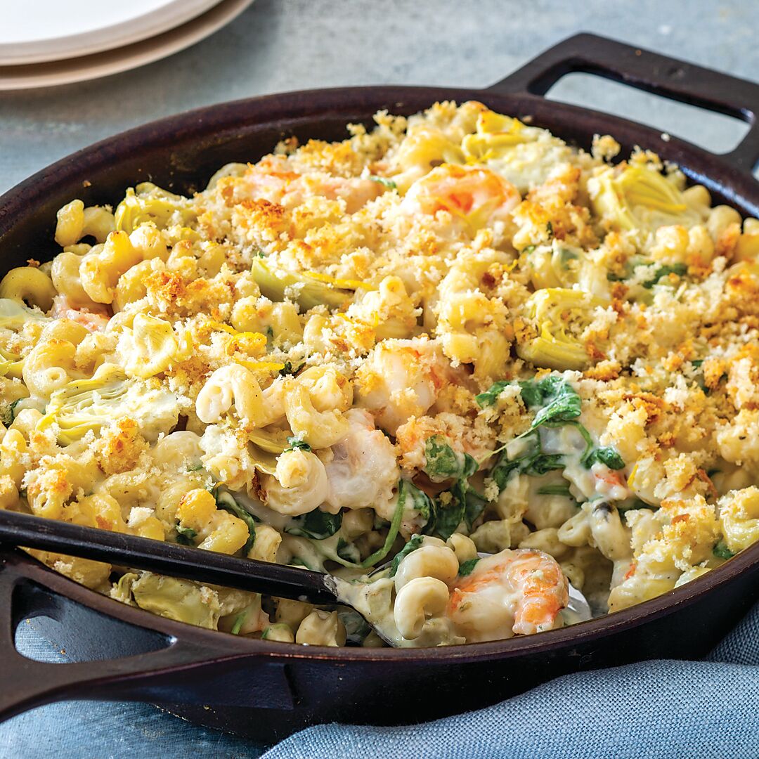 A play on the well-loved dip, this casserole is both wholesome and hearty, filled with shrimp, pasta, artichokes, and spinach and then finished with a cheesy, crispy topping.