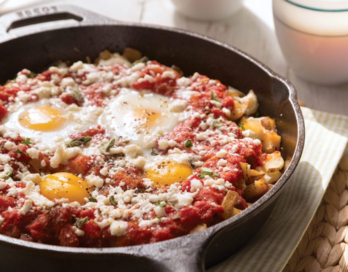 - In a 10-inch cast-iron skillet, heat oil over medium-high heat. Add sausage and onion. Reduce heat to medium; cook until sausage begins to brown, about 3 minutes. Add potatoes, garlic, remaining 1⁄2 teaspoon salt, and remaining 1⁄4 teaspoon black pepper; cook until lightly browned, about minutes. Pour tomato sauce over potatoes. Make 4 indentations in mixture; crack 1 egg into each.