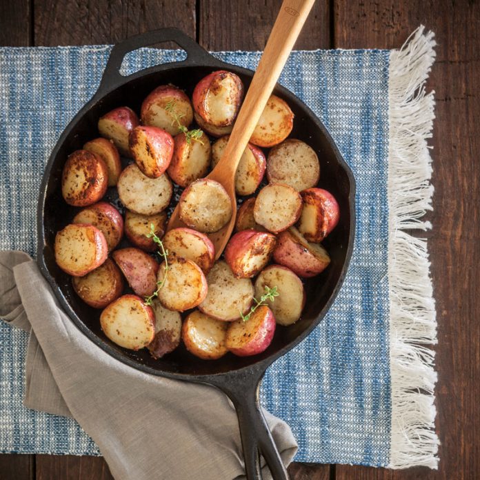 - Arrange potatoes in skillet cut side down in an even layer. Return skillet to heat; cook over medium heat, until bottoms of potatoes are browned and crisp, 8 to 10 minutes.