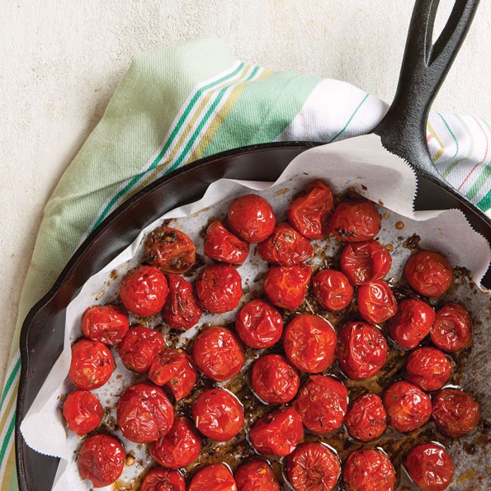 - Add cherry tomatoes and drizzle with olive oil; sprinkle with herbs de Provence, garlic, salt, and red pepper.
