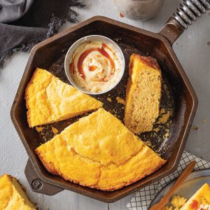Use up a bumper crop of seasonal sweet potatoes with this moist, tender cornbread. Don’t forget the spiced sorghum butter—it takes it over the top.