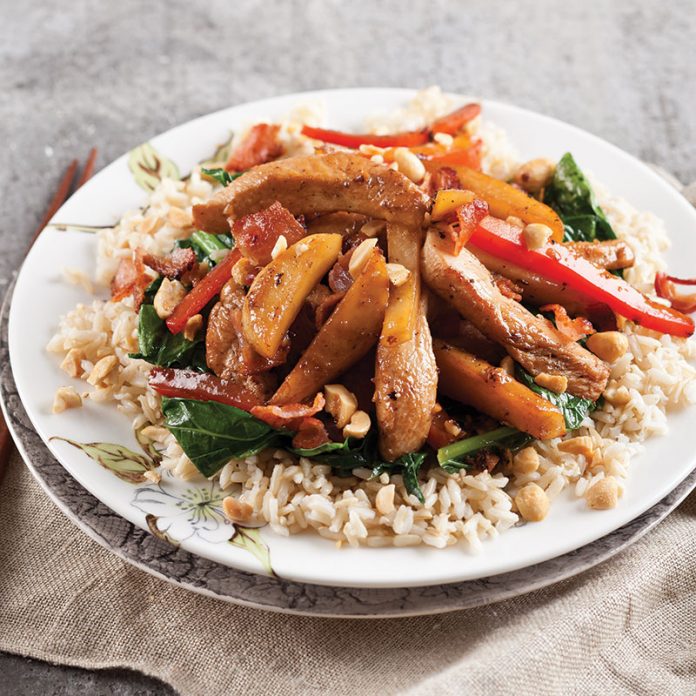 5. Divide rice and turnip greens among 4 serving plates. Top with chicken mixture. Sprinkle with reserved bacon, peanuts, and green onion.