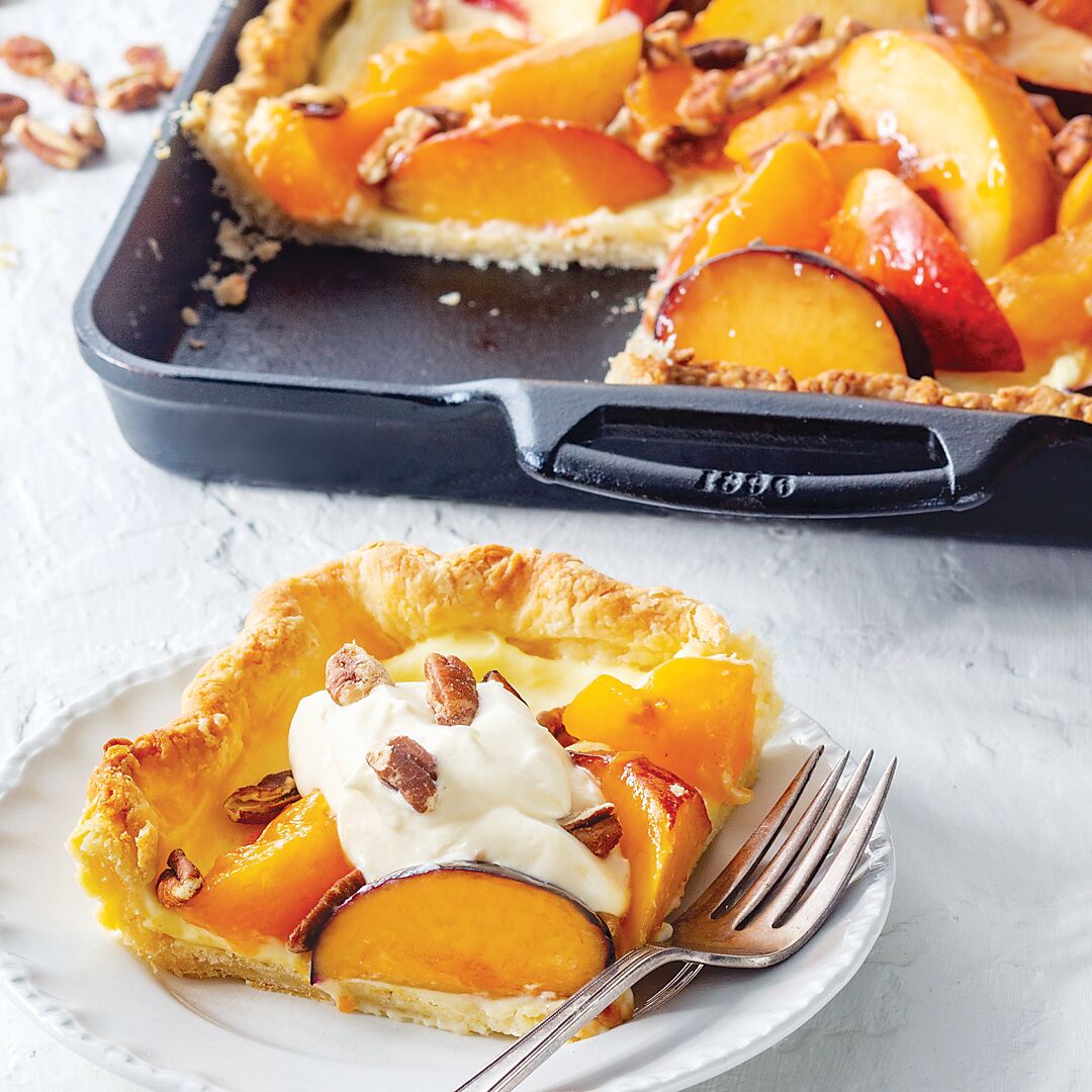 KITCHEN TIP: Although this recipe may seem intimidating, each step can be done in advance, and the pie can be assembled right before you eat. We used a mix of apricots, peaches, and plums, but you can use any single stone fruit or combination of them that you like. Peeling the fruit is optional as well. If you don’t have a 15×10-inch cast-iron baking pan, the pie can be made in a traditional metal baking sheet of the same size.