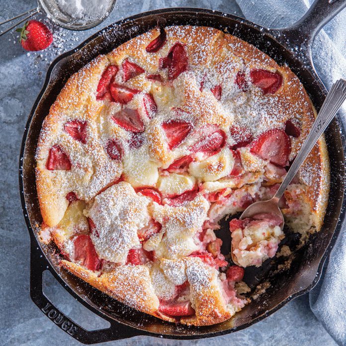 4. In a large bowl, whisk together flour, baking powder, salt, and remaining 1½ cups granulated sugar. Whisk in milk until smooth. Pour batter into melted butter in skillet (do not stir together).