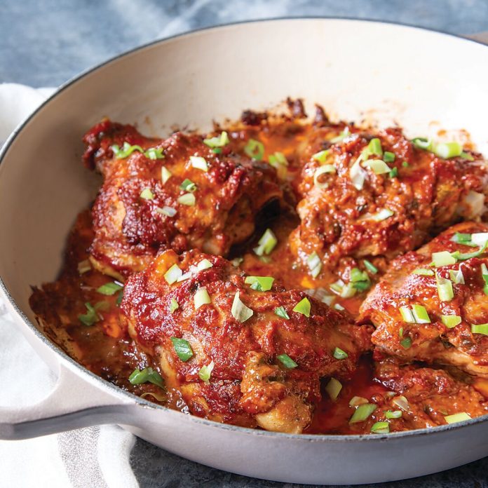 Smoky and sweet in all the right ways, this chicken dinner is bursting with flavor. Serve with cooked rice or your grain of choice to soak up the yummy pan sauce.