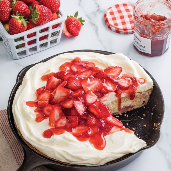 This skillet cake will be a new staple in your kitchen thanks to the rich, fluffy frosting, irresistible drizzles of preserves, and fresh strawberries.