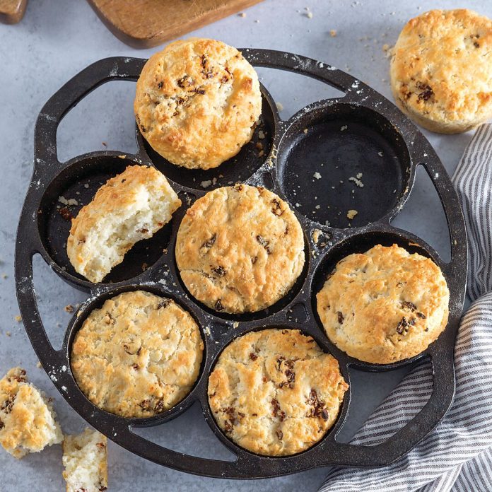 - Spoon dough into wells of prepared pan. With floured hands, lightly press dough into wells of pan. Brush remaining 1 tablespoon milk onto biscuits.