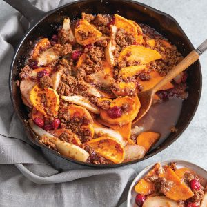 When a delicious autumn crisp comes to mind, you probably don’t think to include vegetables. But the combination of seasonal fruits like cranberries and pears is the perfect contrast to sweet potatoes.