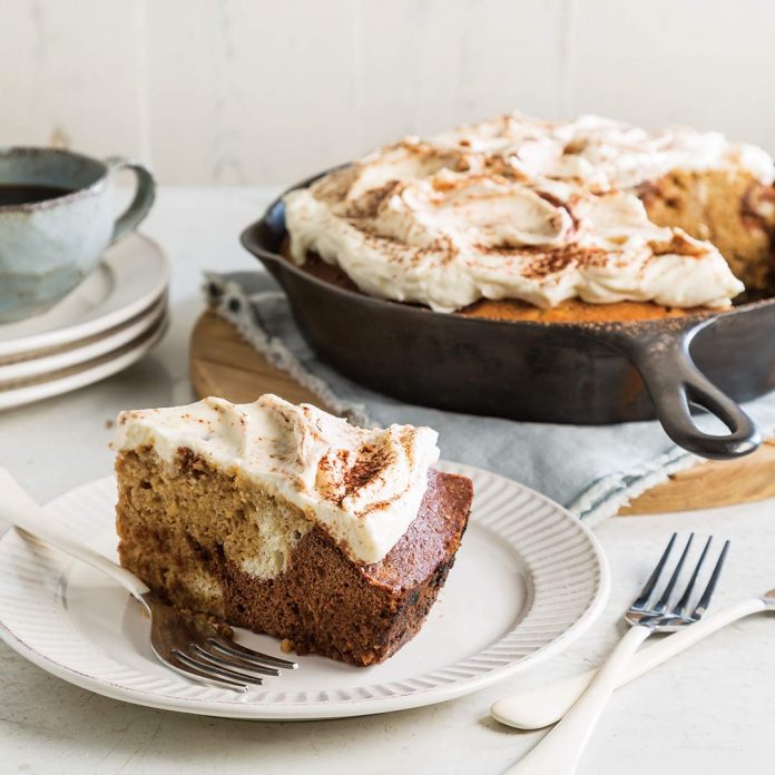 mixer on low speed, gradually add flour mixture to butter mixture alternately with milk, beginning and ending with flour mixture, beating just until combined after each addition. - Spoon 2 cups batter into a medium bowl; add cocoa, 3 tablespoons water, and remaining ¼ cup sugar, whisking until smooth. Using a ½ cup, alternately drop batters into prepared skillet. Swirl batters with the tip of a knife. Tap skillet on