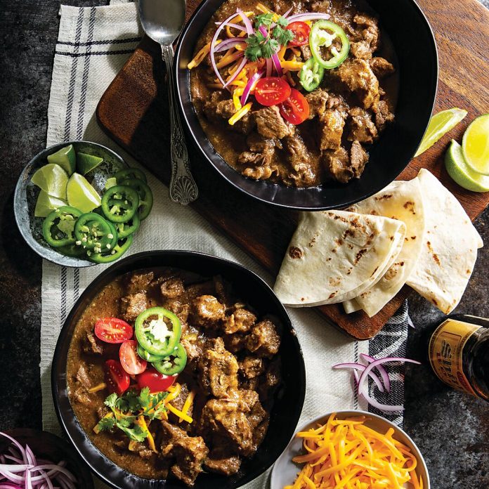 Texans debate whether their style of chili should have tomatoes or if the beef should be ground or in pieces, but the one unifying rule is absolutely no beans allowed. We like the fresh sweetness that tomatoes bring to this spicy concoction, but we kept them on the side so folks can fix their own perfect bowl of chili.