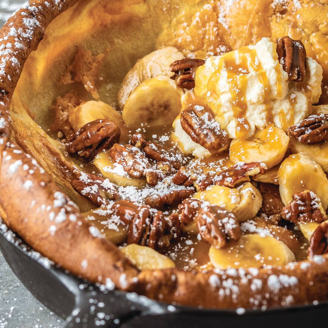 - Bake for 10 minutes. Reduce oven temperature to 400°, and bake until dark golden brown, about 10 minutes more. Serve immediately with Bourbon Caramel, bananas, and pecans. Garnish with confectioners’ sugar, if desired.