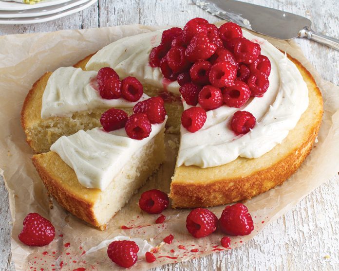 - For frosting: In a large bowl, beat butter, cream cheese, and reserved vanilla bean seeds with a mixer at medium speed until creamy. Add confectioners’ sugar, beating until combined. Stir in buttermilk until a spreadable consistency is reached. Spread frosting on top of cake. Garnish with raspberries, if desired.