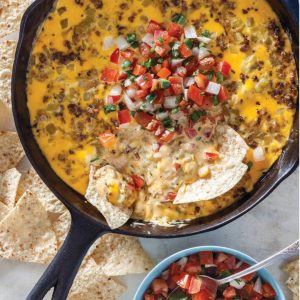 I recently celebrated another significant birthday, and por supuesto (of course), I served queso. To help it stay warm, I made it in my thick-walled cast-iron skillet. I baked it at a low temperature to melt the cheese down to that perfect mouthwatering, molten consistency, and served it warm with my own little addition: a mountain of fresh pico de gallo.